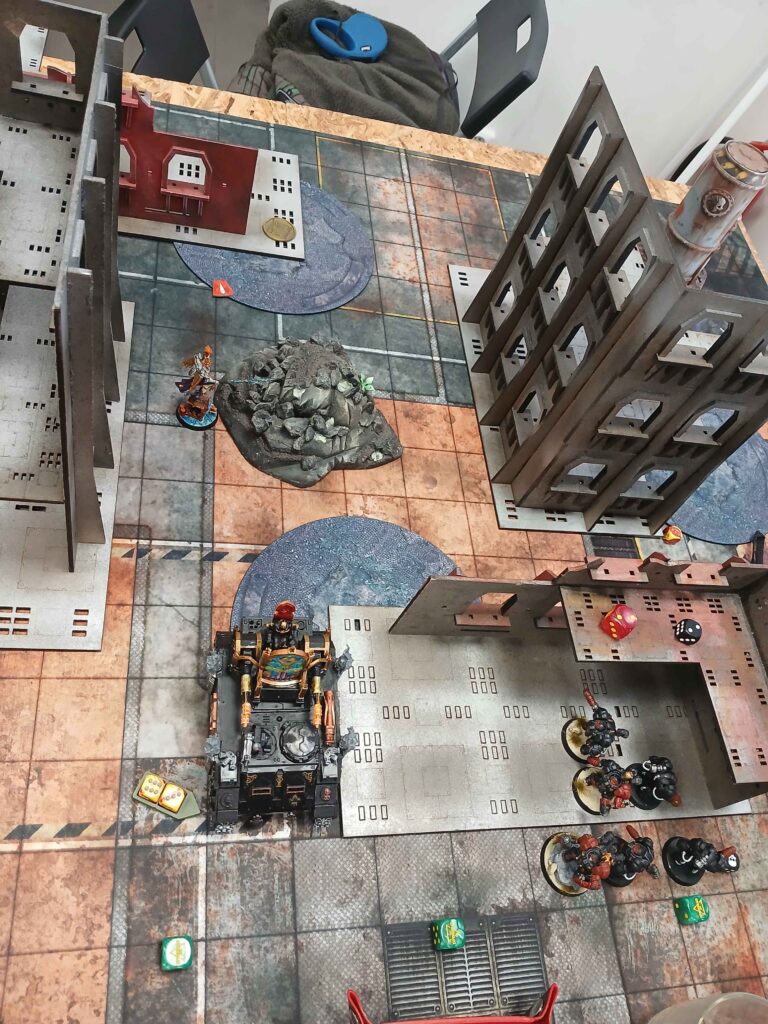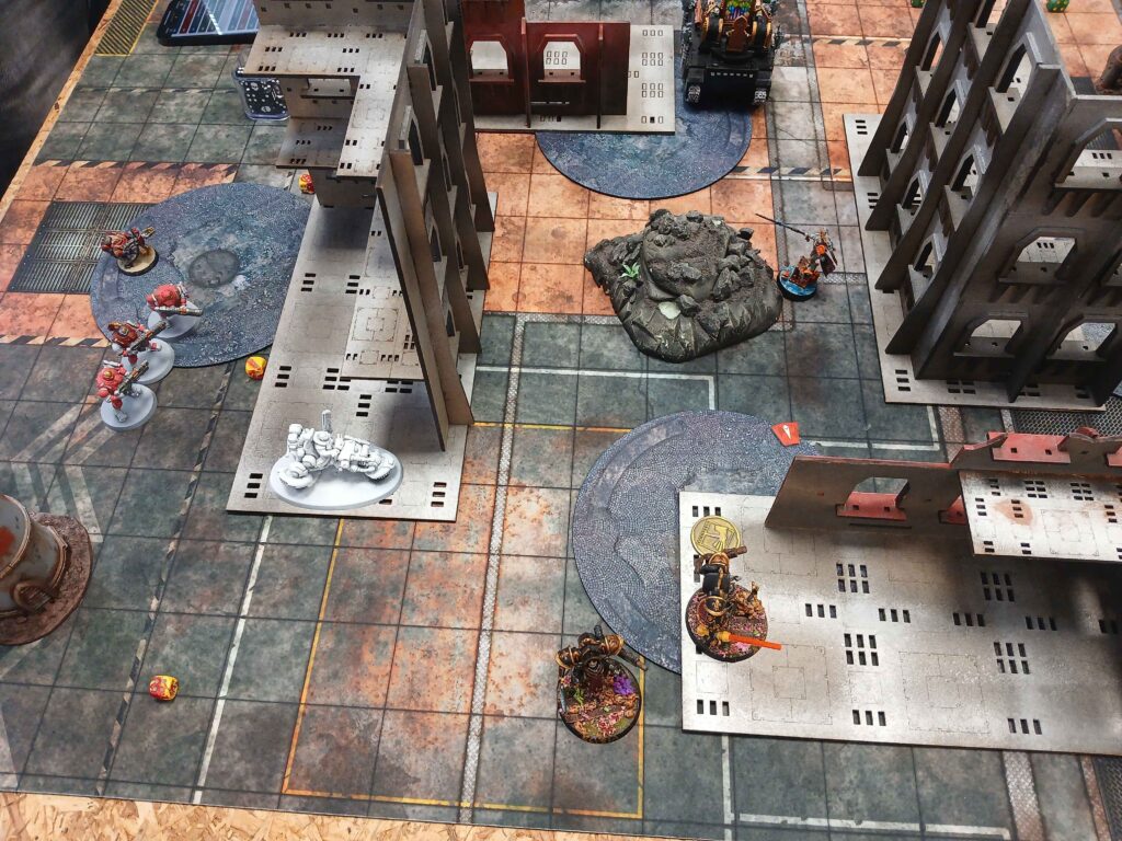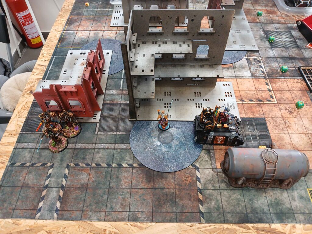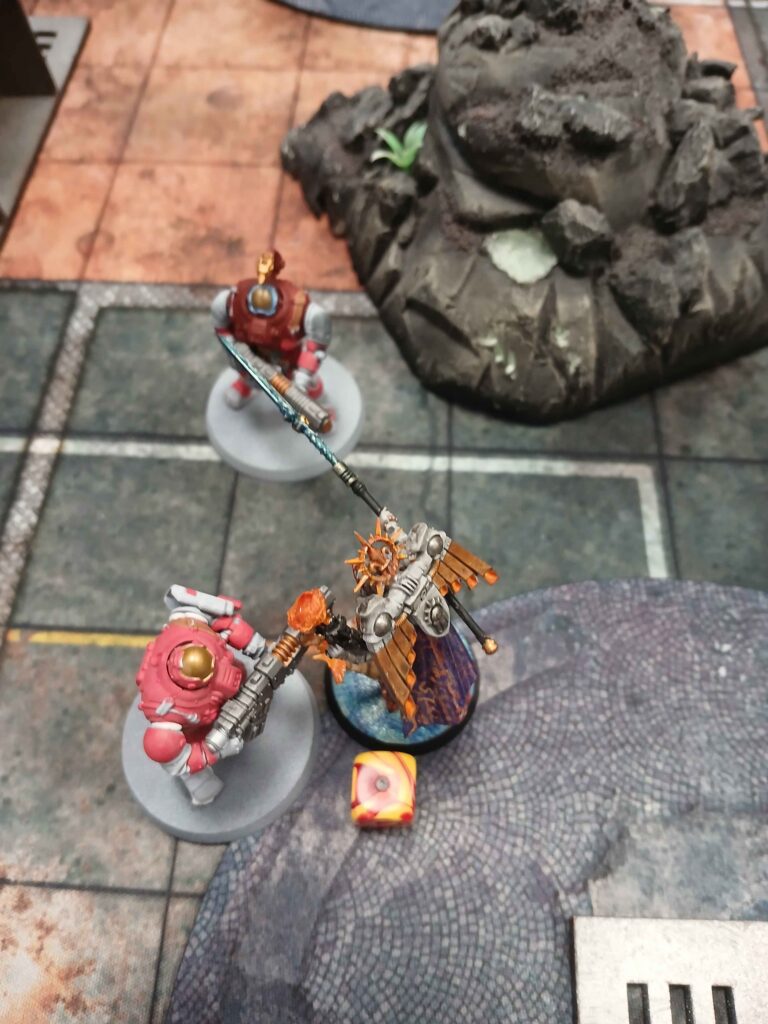 Nasledoval brutalni skirmish, kde warsuity utrpely drtivou ranu a byly poslany do opravy. To bylo urcite tim ze Miranda preferovala solo meditaci se svym warsuitem mimo bitvu. Alenya umrela, vzala trpasliky s sebou, ozivila se a potom jako kometa na 1 woundu proletela bojiste, skrz overwatch na ktery mohla umrit, a byla posledni model na stole.